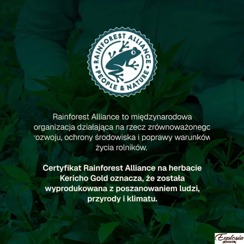 Herbata uprawiana jest na żyznych, wulkanicznych glebach w strefie równikowej, co zapewnia jej jasny, klarowny kolor naparu i intensywny, naturalny smak. Kericho Gold jest w 100% wolna od pestycydów, co czyni ją wyborem bezpiecznym i odpowiedzialnym.