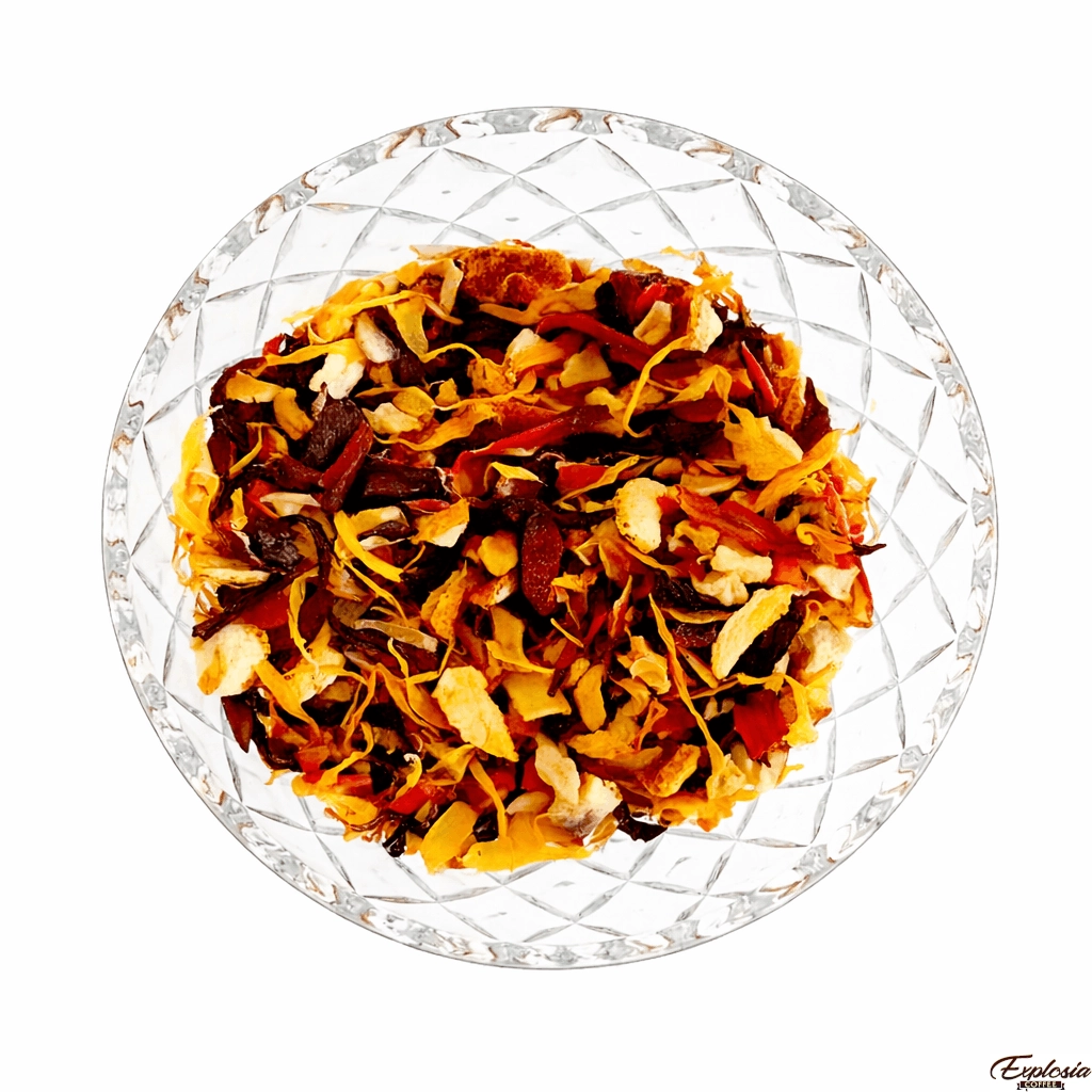 Napar owocowy – Pomarańcza z Imbirem nie tylko doskonale smakuje, ale również zachwyca wyglądem – widoczne kawałki owoców podkreślają wysoką jakość produktu i jego naturalny charakter.