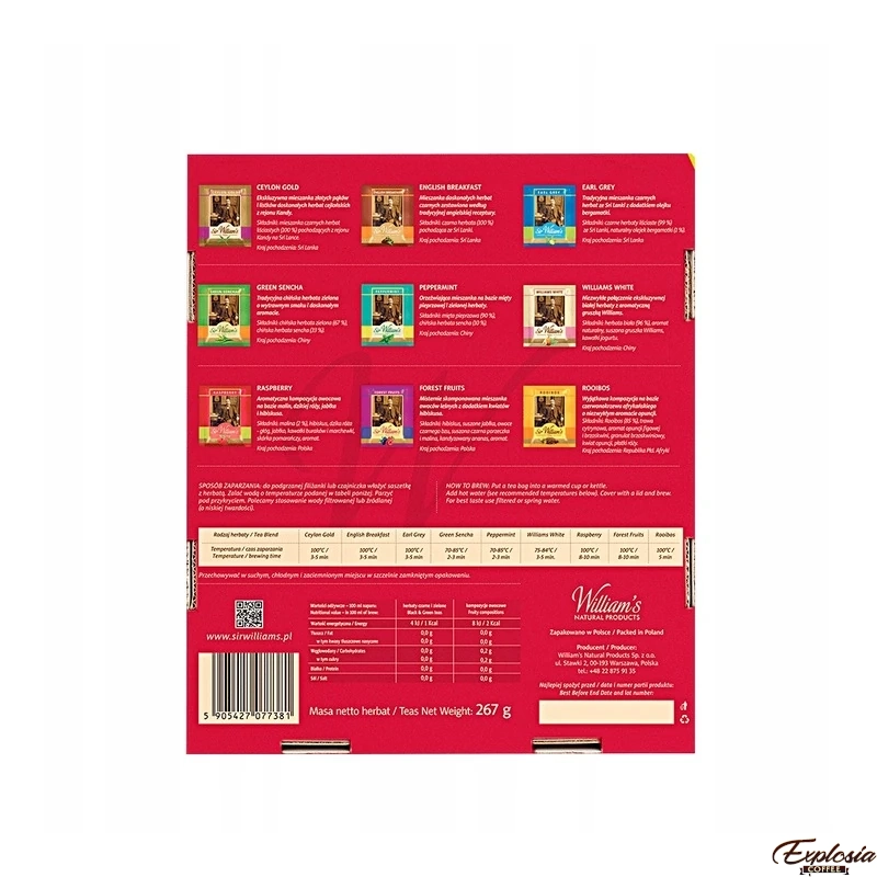 Prezenter Sir William's Tea zawiera selekcję 9 smaków herbat po 15 saszetek są to: