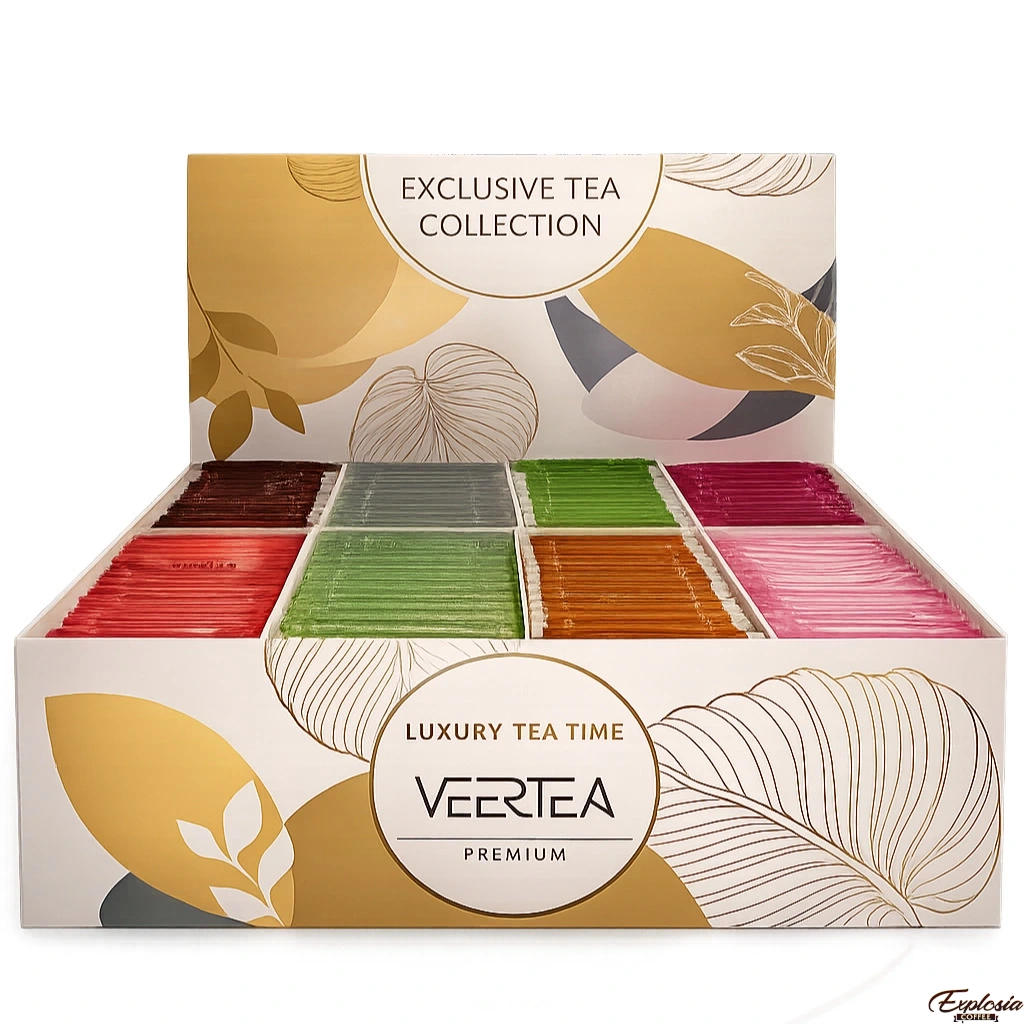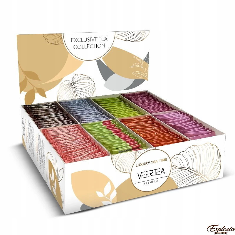 Veertea Kolekcja Herbat Zestaw 8 Smaków 200 Kopert Biało - Złota oferuje wiele smaków – od klasycznych herbat czarnych po delikatne kompozycje owocowe i ziołowe. Każda saszetka została starannie przygotowana, aby zapewnić intensywny aromat oraz zrównoważony smak. Dzięki różnorodności mieszanki można dopasować napar do pory dnia – od energetycznego poranka po relaksujący wieczór.