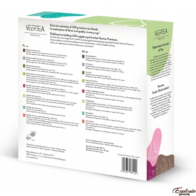 Veertea Kolekcja Herbat Zestaw 8 Smaków 200 Kopert Jasno Zielony to doskonały wybór dla osób, które chcą odkrywać różnorodne aromaty w jednej kolekcji. Sprawdzi się zarówno w codziennym użytkowaniu, jak i podczas spotkań z gośćmi. Aby przygotować idealną filiżankę, zalej jedną saszetkę około 200 ml gorącej wody (95–100°C) i parz przez 3–5 minut, w zależności od preferowanej intensywności smaku.